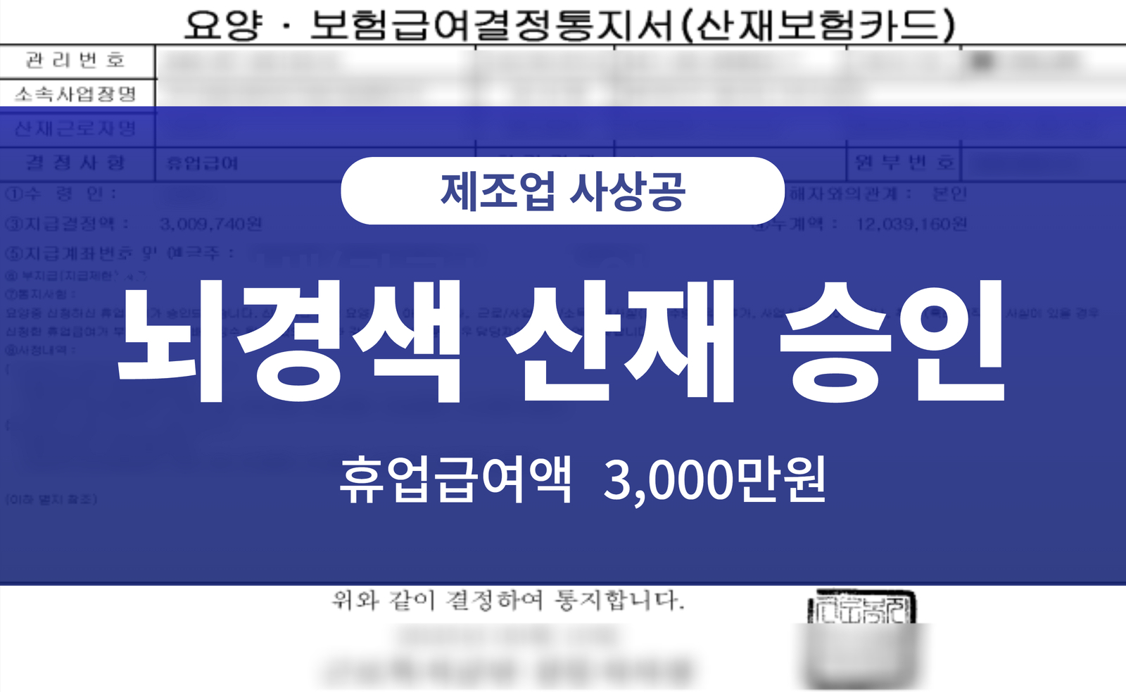 뇌경색에 대해 과로로 인한 산재를 승인 받게 되었습니다.